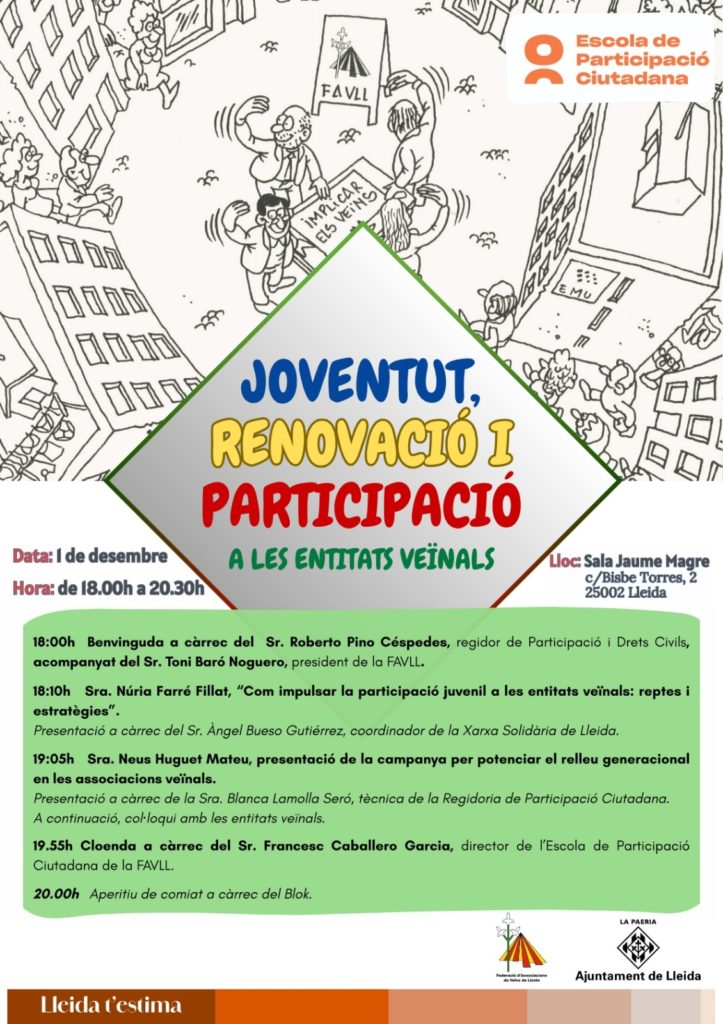 L’Escola de Participació Ciutadana de la Federació d’Associacions de Veïns de Lleida (FAVLL) i la Regidoria de Participació i Drets civils de l’Ajuntament de Lleida organitzen la Jornada “Joventut, renovació i participació a les entitats veïnals”, a la qual s’ha convidat a participar els representants de les associacions veïnals, als seus grups de joves i d’altres entitats lleidatanes, així com representants de les nostres institucions. L’objectiu principal d’aquesta jornada és aprofundir el treball per afavorir el relleu intergeneracional en les nostres entitats i en general.