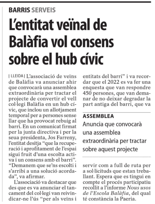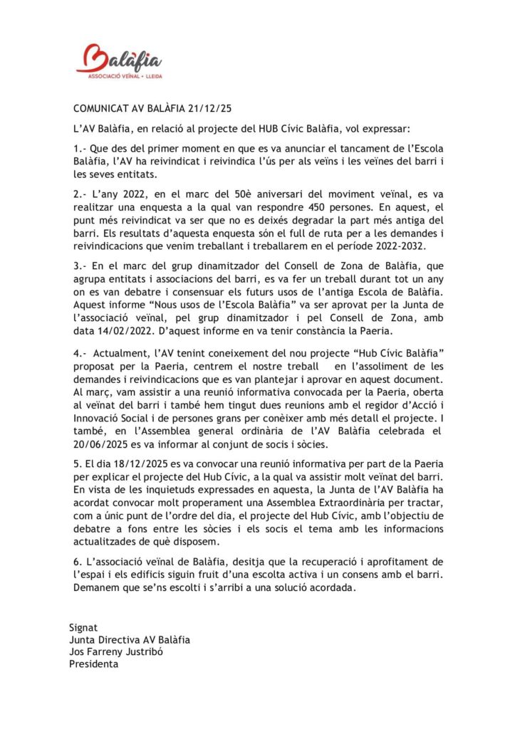 Comunicat HUB Cívic Balàfia