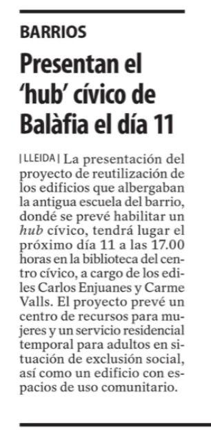 Per indicació de la regidora Carme Valls, i atenent la seva petició l’informem que el proper 11 de desembre, a les 17h, a la biblioteca del Centre cívic de Balàfia es farà la 2a presentació del projecte Hub Cívic Balàfia.