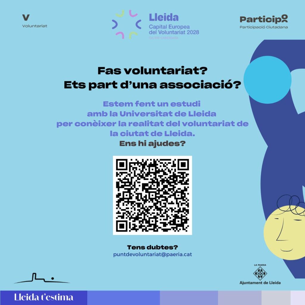 ✅ Per fer-ho possible i donar-li més pes, la Universitat de Lleida està fent un estudi per mostrar la realitat del voluntariat i l’associacionisme de la ciutat. Voldríem que la vostra hi quedés reflectida. Es basa en enquestes que us demanem que contesteu: https://participacio.paeria.cat/voluntariat/candidatura-capitalitat-europea-del-voluntariat/#projesdasdasdctes